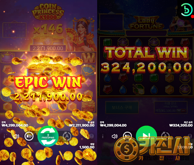 미쳤다 소름 돋았음. 왼쪽 코인 프린세스에서 146배수 터지면서 221만 원 에픽 윈 찍어버림. 오른쪽 레이디 포춘도 32만 원 토탈 윈으로 깔끔하게 마무리함. 멀티슬롯 안 썼으면 이 짜릿함 한 번에 못 느꼈을 거다. 오늘 축제니까 다들 기 받아가라!